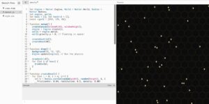 Bringing in Matter.js. I created the physics engine, turn off gravity so things float, and spawn our “bees” (physical circles) into the world.