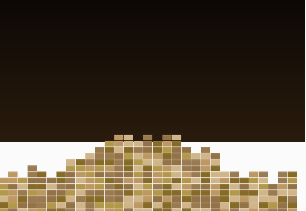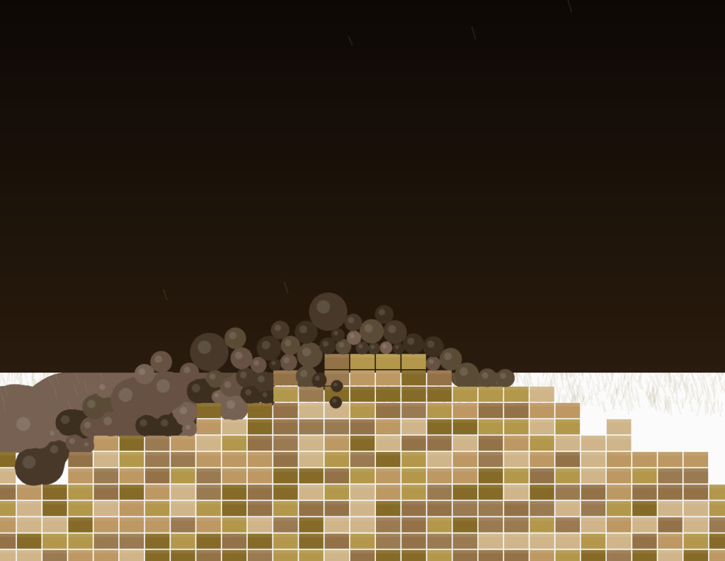 The first milestone was drawing the terrain. I wrote a heightmap function that builds a mesa shape, peaks in the center, and slopes toward the edges, with small random offsets per column to roughen the silhouette. I added a sky gradient and a highlight strip on the top face of each block so the structure looked like real layered rock before any physics was involved.