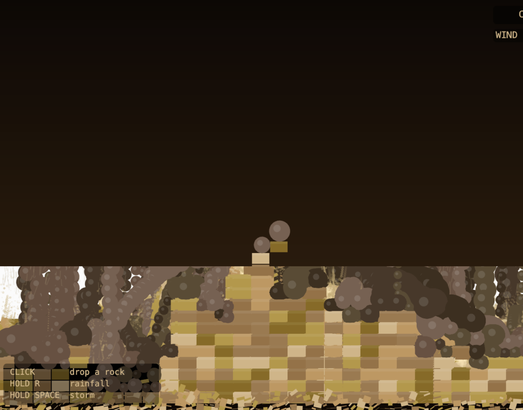 The piece works well as a slow process. Dropping one rock at a time and watching the terrain wear down has a satisfying quality. The storm mode makes the erosion visible in seconds and shows how the system handles high load. The wind system adds unpredictability without feeling random because it drifts gradually rather than jumping between values.