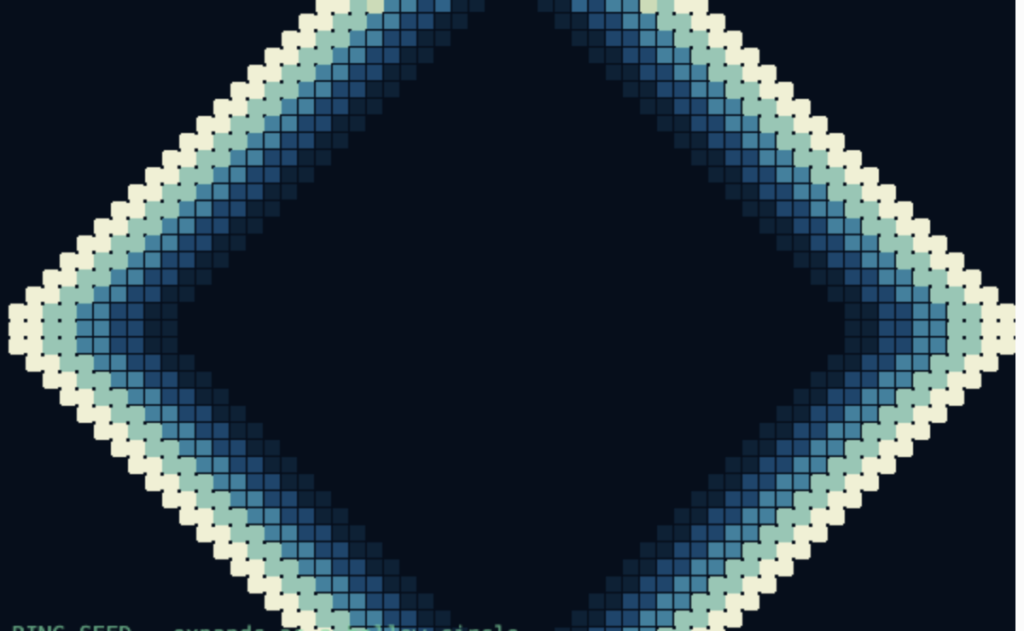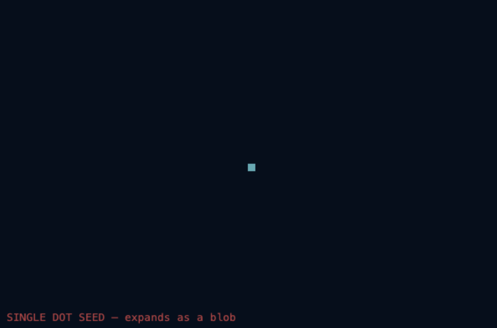 When a user clicks, a small ring of cells is planted. The ring shape is important. A single dot would expand as a filled blob. A ring seed gives the CA the right structure to start expanding as a hollow circle. The dist check selects only cells that fall on the boundary of that radius. This is what makes it look like a cast net rather than a spreading stain.