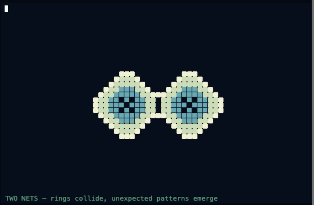 The moment the ring seed worked was when the project finally felt like something. Before that it was just another cellular automata sketch. Once the net started expanding from a click, it became connected to something real.