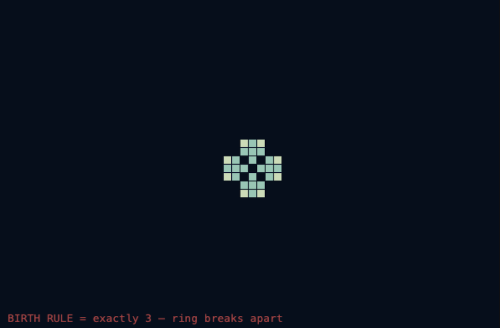 Getting the birth rule right. Using exactly 3 young neighbors caused the ring to break apart into fragments. Changing to 2 or 3 young neighbors kept the ring solid as it expanded. That one number made the difference between scattered dots and a clean circle.